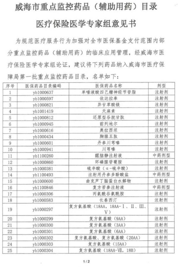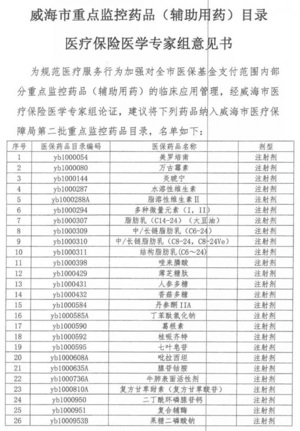 此前,业内流传的《威海市重点监控药品(辅助用药)目录医疗保险医学专家组意见书》显示,威海市共有两批次重点监控药品,目录覆盖112个品目。