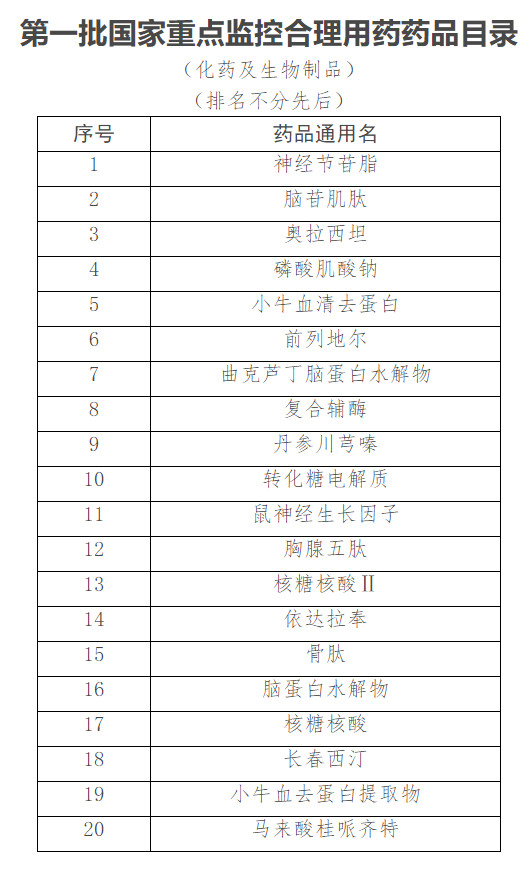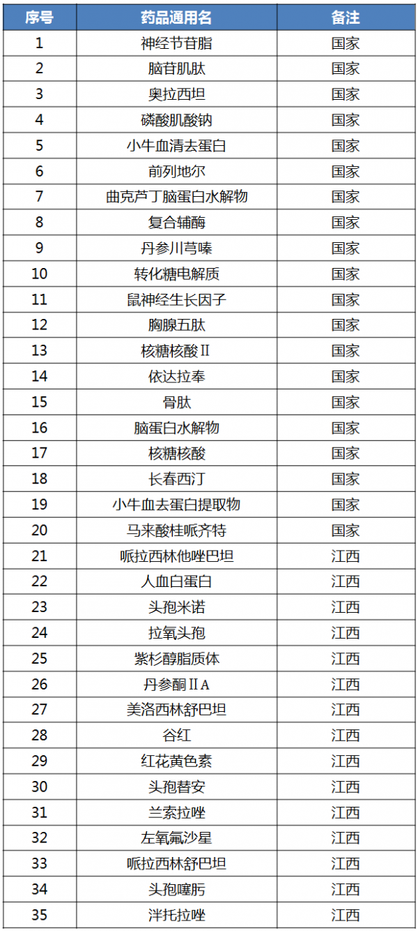层层增补:监控名单越来越长 7月16日,江西省卫健委发布《江西省第一批重点监控合理用药药品目录》,共涉及35个药品通用名。该目录是在3月份江西省重点药品监控目录(20个)基础上,合并了国家版重点监控目录。相比国家版目录,共增加了15个药品通用名。 江西省第一批重点监控合理用药药品目录