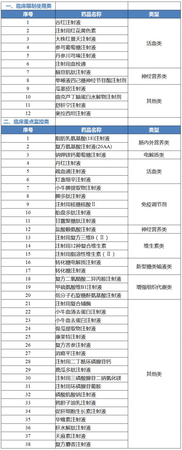 其中,重点管理辅助用药目录分成两类,一类为临床限制使用,共涉及12个品种;第二类为临床重点监控类,共涉及38个品种。