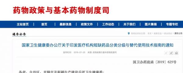 7月25日,国家卫健委药物政策与基本药物制度司发布《国家卫生健康委办公厅关于印发医疗机构短缺药品分类分级与替代使用技术指南的通知》(以下简称《通知》)。