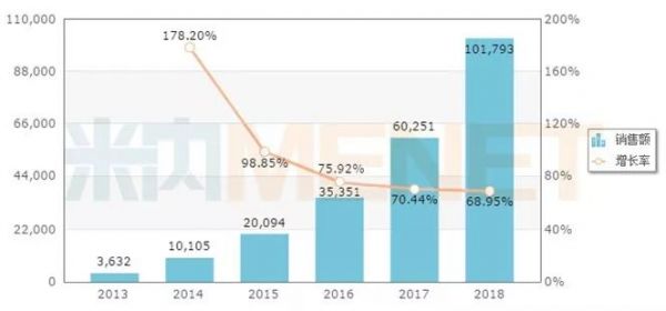 2013-2018年中国公立医疗机构终端替格瑞洛片销售额(万元)
