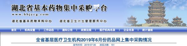 7月30日,湖北省基本药物集中采购平台发布《全省基层医疗卫生机构2019年6月份药品网上集中采购情况》。