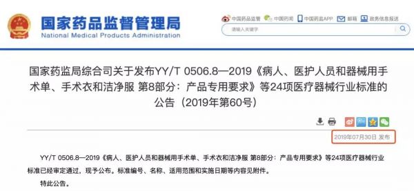 7月30日,国家药监局官网发布了《病人、医护人员和器械用手术单、手术衣和洁净服 第8部分:产品专用要求》等24项