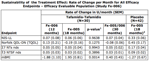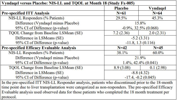 对该药在欧盟的批准是基于关键的临床试验(Fx–005)和公开标记的为期12个月的扩展研究(Fx–006)的结果。Fx–005结果表明,VYNDAQEL组患者与安慰剂组患者相比,神经功能、大纤维功能(用活动强度来衡量)和小纤维功能(用感官来衡量)的退化减轻51-81%。