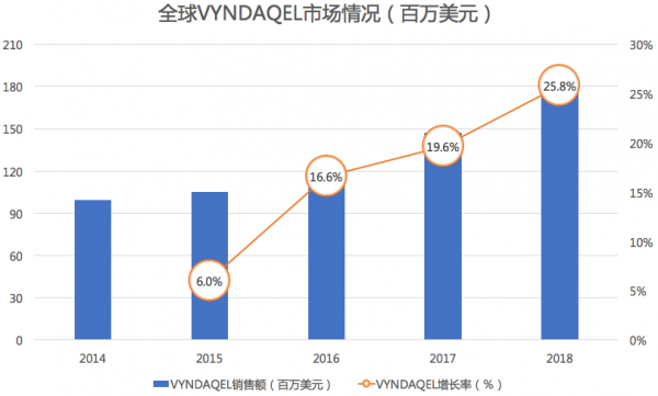 根据药物综合数据库(PDB)显示,在全球范围内随着VYNDAQEL的获批国家不断增加,其销售额也在持续走高。截止目前VYNDAQEL已在欧美、日本、韩国等20余个国家上市,2018年销售1.8亿美元,同比增长25.8%。