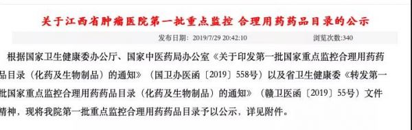 据查询,在江西省肿瘤医院之前,7月15日,江西省卫健委发布了《转发第一批国家重点监控合理用药药品目录(化药及生物制品)的通知》赣卫医函〔2019〕55号。