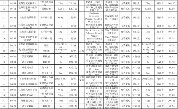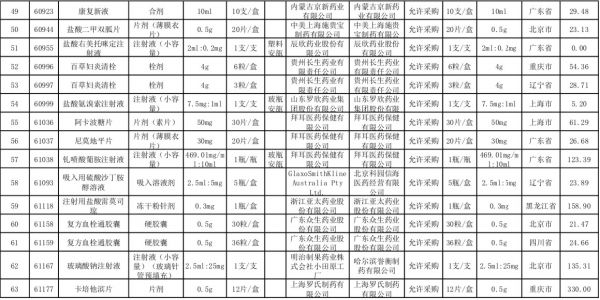据梳理,此次有63个药品公布了全国最低价,包括缬沙坦胶囊、注射用奥美拉唑钠、盐酸贝那普利片、他莫克司胶囊、阿托伐他汀钙片、阿奇霉素片、苯磺酸氨氯地平片、瑞舒伐他汀钙片、盐酸二甲双胍缓释片、注射用美罗培南、硫酸氢氯吡格雷片、盐酸右美托咪定注射液、阿卡波糖片等临床常用大品种。