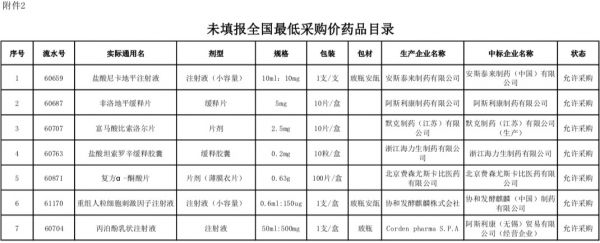 此外,还有7个药品未填报全国最低采购价,包括盐酸尼卡地平注射液、非洛地平缓释片、富马酸比索洛尔片、盐酸坦索罗辛缓释胶囊、重组人粒细胞刺激因子注射液、丙泊酚乳状注射液等,涉及安斯泰来、阿斯利康、默克、费森尤斯卡比等6家药企。