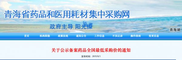 8月1日,青海省药品和医用耗材集中采购网发布《关于公示备案药品全国最低采购价的通知》。
