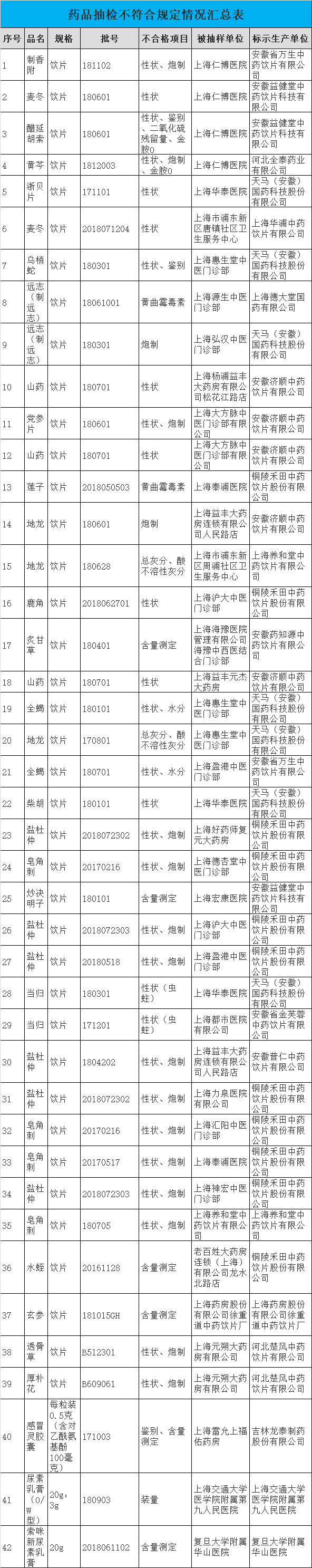 通告显示,近期,上海市药监局组织相关单位对本市药品生产、经营和使用单位开展了质量抽检,其中有42批次药品不符合规定,不符合规定项目包括性状、含量、水分等。而不符合规定药品中,有39批次为饮片,3批次为制剂。