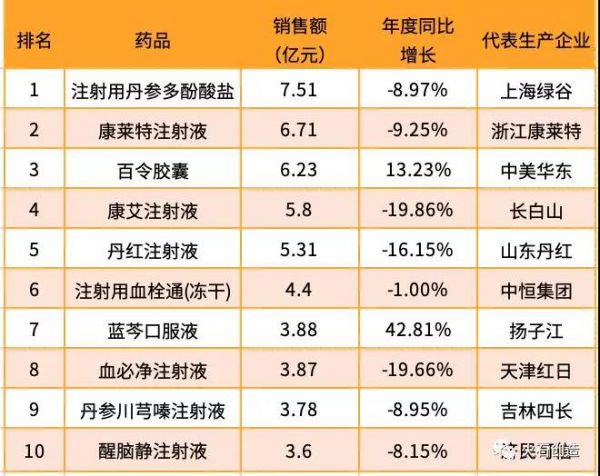 表2 2018年我国重点城市公立医院销售额TOP10中成药情况