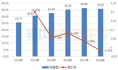 图2 2013—2018年重点城市公立医院终端中药注射剂销售情况