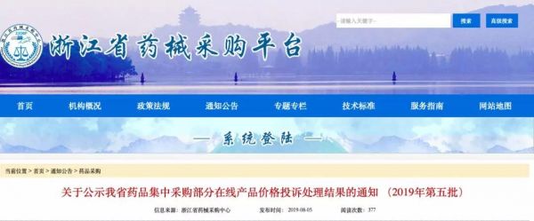8月5日,浙江省药械采购中心发布《关于公示我省药品集中采购部分在线产品价格投诉处理结果的通知(2019年第五批)》(以下简称《通知》)。
