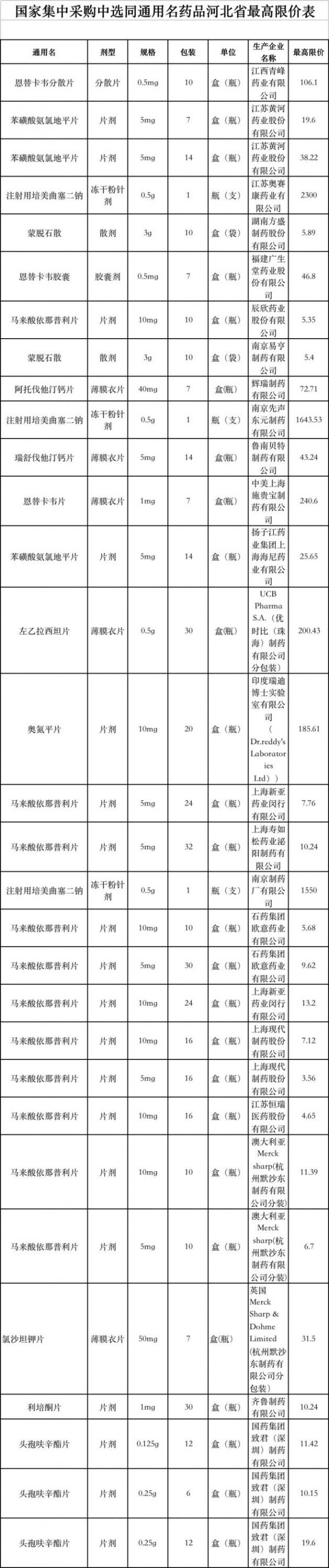 从河北省公布的最高限价表可以看出,共有31个品规确认了其最高限价,包括江西青峰药业的恩替卡韦分散片,辉瑞的阿托伐他汀钙片,石药的马来酸依那普利片等品规。