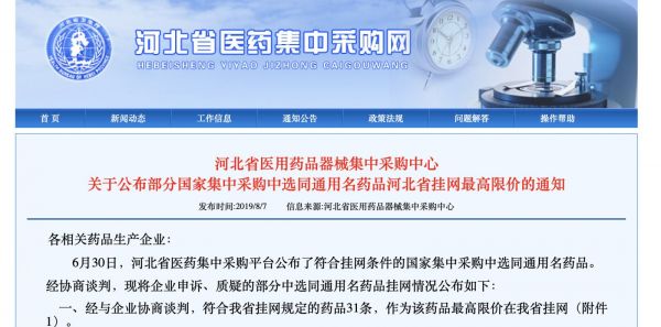 近日,河北省公布了《部分国家集中采购中选同通用名药品河北省挂网最高限价的通知》(以下简称《通知》)。