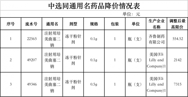 其中,齐鲁制药和礼来的注射用培美曲塞二钠经调整后也确认了最高限价。