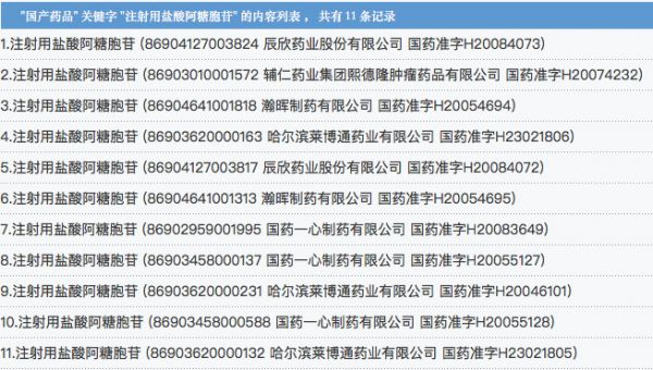 据国家药监局网站数据库,注射用盐酸阿糖胞苷的批准文号有11个,由国药一心制药、瀚晖制药、辰欣药业、辅仁药业集团等5家药企持有。