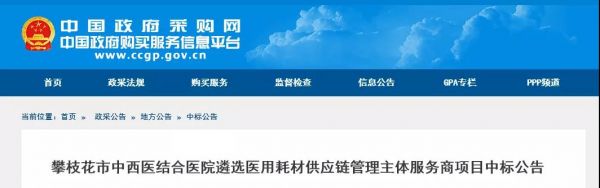 8月初,中国政府采购网发布《攀枝花市中西医结合医院遴选医用耗材供应链管理主体服务商项目中标公告》。