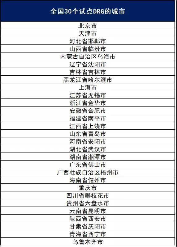5月24日,国家医保局官网发布消息,国家医疗保障局在近日召开了疾病诊断相关分组(DRG)付费国家试点工作启动视频会议。会议公布DRG付费国家30个试点城市名单,介绍了DRG付费国家试点工作的筹备情况和主要内容。