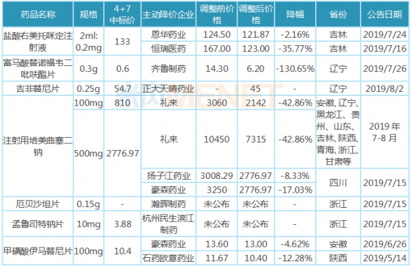 注射用培美曲塞二钠,首批带量采购由四川汇宇制药中标,落标的原研厂家礼来随后在多地主动降价,7-8月就已在超过10个城市申请调价,但最终挂网价与中标价仍有一段差距。近期,未过一致性评价的扬子江与豪森药业在四川主动联动中标价。