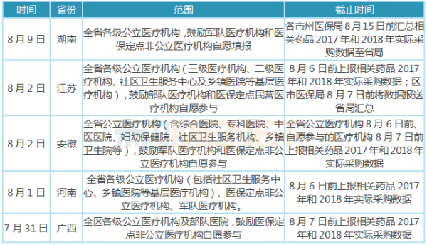 7月29日,由国家医保局发布的《关于国家组织药品集中采购和使用试点扩大区域范围有关工作安排的通知》流出,通知要求各省医保局(除4+7城市及福建、河北外):1、7月31日前,报送联合采购办公室成员及联络员名单;2、7月31日前,填报试点扩围工作委托书;3、8月9日前,汇总公立医疗机构“4+7”的25个品种在2017年和2018年的实际采购数据。