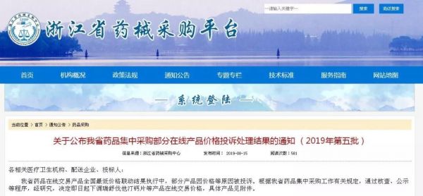 8月15日,浙江省药械采购中心发布《关于公布我省药品集中采购部分在线产品价格投诉处理结果的通知(2019年第五批)》(以下简称《通知》)。