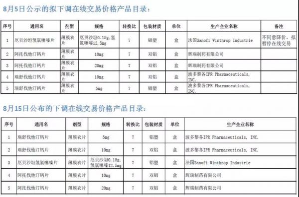 对比10天前该中心公示的处理结果,此前“不同意降价,拟暂停在线交易”的法国赛诺菲的厄贝沙坦氢氯噻嗪片终于也没再坚持,与辉瑞制药的阿托伐他汀钙片、波多黎各IPR Pharmaceuticals, INC.公司的瑞舒伐他汀钙片一同,下调在线交易价格。