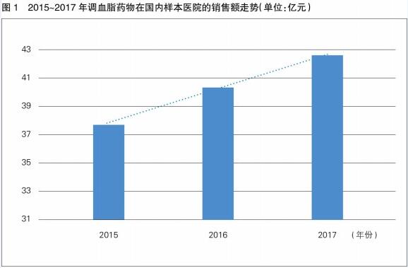 2017年,调血脂药物在国内样本医院的销售额在心血管用药各亚类中位居第一,约达到43亿元(见图1)。2015~2017年,调血脂药物在心血管用药中的市场份额处在前列,复合年均增长率(CAGR)为4.3%,增长幅度在心血管用药各亚类中处在中游位置。