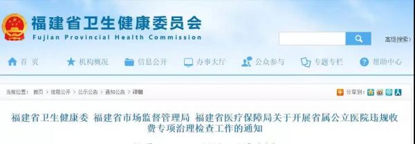 近日,福建省卫健委官网发布《福建省卫生健康委 福建省市场监督管理局 福建省医疗保障局关于开展省属公立医院违规收费专项治理检查工作的通知》(以下简称《通知》)。
