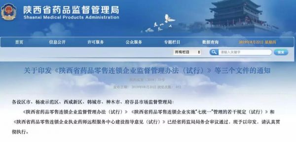 近日,陕西省药品监督管理发布三个文件,提出对陕西省药品零售连锁企业的监督管理办法。