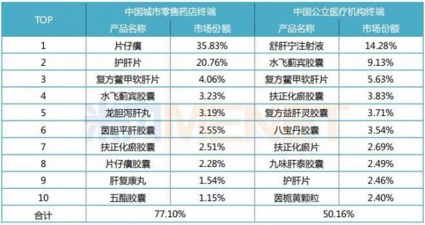 据米内网数据显示,2018年中国城市零售药店终端中成药肝炎用药市场规模上涨至17亿元,增长率为8.56%,TOP10产品合计市场份额超过七成;2018年中国城市公立医院、县级公立医院、城市社区中心及乡镇卫生院(简称中国公立医疗机构)终端中成药肝炎用药市场规模为58亿元,增长率为6.43%,TOP10产品合计市场份额为50.16%。