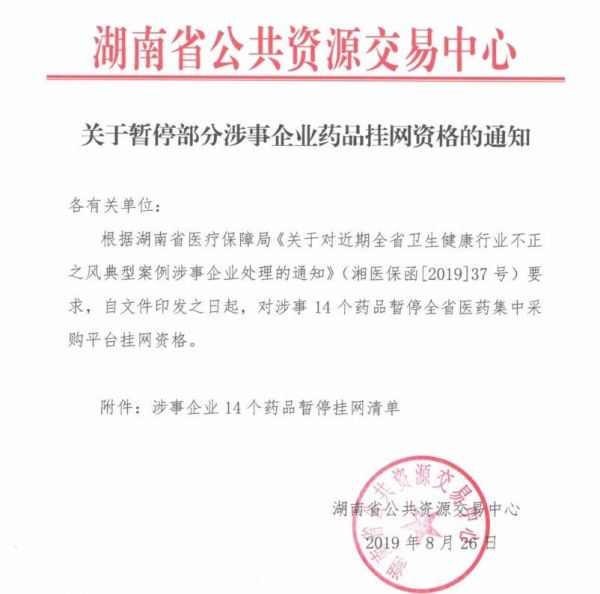 近日,湖南省公共资源交易中心发布《关于暂停部分涉事企业药品挂网资格的通知》,文件显示:根据湖南医保局 《关于对近期全省卫生健康行业不正之风典型案例涉事企业处理的通知》 要求,自文件印发之日起,对涉事14个药品暂停全省医药集中采购平台挂网资格,其中大部分为中药注射剂。