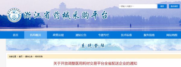 9月2日,浙江省药械采购平台发布《关于开放调整医用耗材交易平台全省配送企业的通知》。决定开放调整医用耗材交易平台全省配送企业。