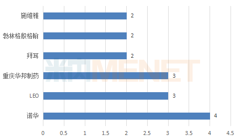 医保新增58个独家化学药共涉及48家企业,跨国药业与国内药企所占品种数不分伯仲,但从单个企业拥有的品种数看,超过2个品种的企业中仅1家为国内药企。诺华以4个新增独家化学药领先,LEO、重庆华邦制药以3个品种数紧接其后。 来源:米内网数据库、上市公司公告