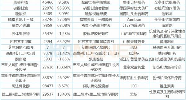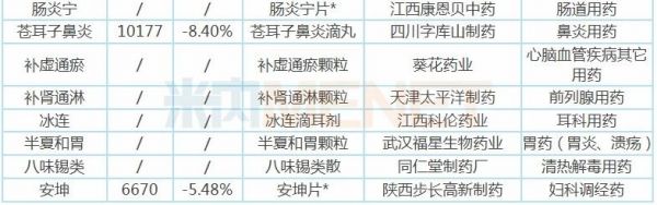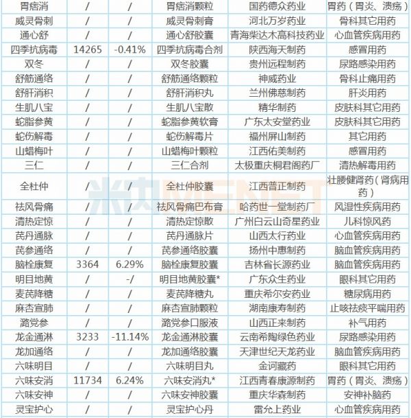 北京同仁堂新增的独家中成药有香连止泻片、复方小活络丸、儿童清肺口服液、八味锡类散;远大健康的有小儿咳喘颗粒(西安碑林药业)、小儿广朴止泻口服液(长春雷允上药业)、灵宝护心丹(雷允上药业);摩美得制药的有止血祛瘀明目片、心速宁胶囊、小儿清热宣肺贴膏;康恩贝的有龙金通淋胶囊(云南希陶绿色药业)、黄莪胶囊(浙江康恩贝制药)、肠炎宁片(江西康恩贝中药)。