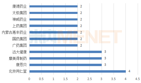 新增的88个独家中成药共涉及73家药企(以集团计),其中新增独家中成药品种数达2个及2个以上的企业有11家,北京同仁堂以4个品种数遥遥领先,远大健康、摩美得制药、康恩贝均以3个品种紧接其后。