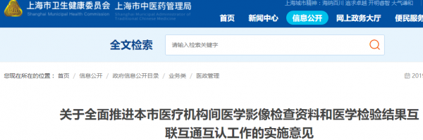 2019年9月4日,上海市卫健委发布一则《关于全面推进本市医疗机构间医学影像检查资料和医学检验结果互联互通互认工作的实施意见》,(以下简称《意见》)。