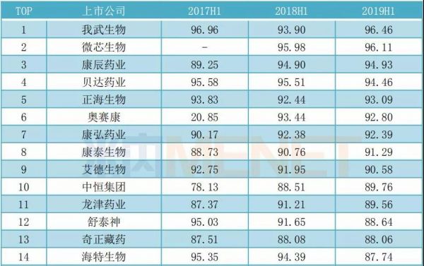 2018上半年我武生物在毛利率榜单中排在第五位。2019上半年营业收入为2.74亿元,同比增长25.43%,净利润为1.30亿元,同比增长25.53%,毛利率重回96%以上。