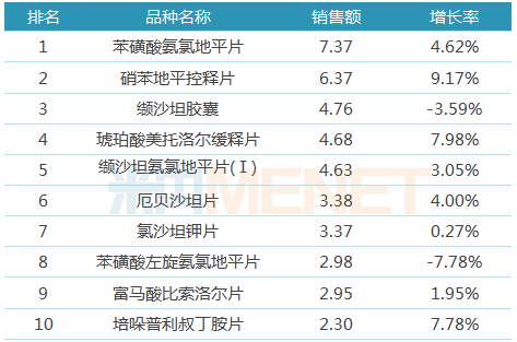 米内网数据显示,近几年来重点省市公立医院化学药终端抗高血压药销售额逐年上涨,2018年达到78.01亿元的市场规模,同比上年增长4.51%,其中,TOP10产品合计销售额42.8亿元,占抗高血压药总体市场比重为54.87%。