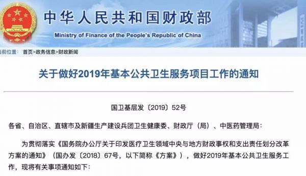 9月9日,中华人民共和国财政部、国家卫健委、国家中医药局发布《关于做好2019年基本公共卫生服务项目工作的通知》(以下简称《通知》)。