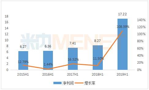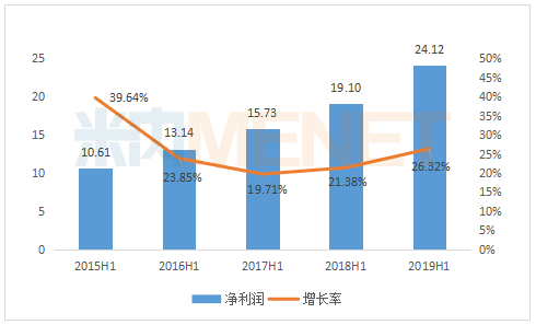 2015H1-2019H1恒瑞医药净利润情况(单位:亿元)