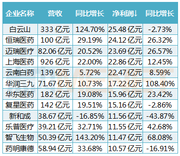2019H1净利润超10亿的药企情况