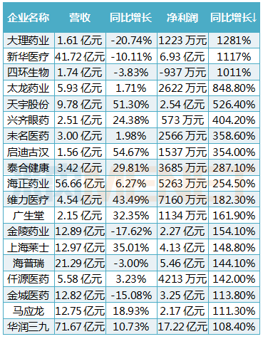 从增长率来看,上半年有19家企业净利润增长超100%。大理药业、新华医疗、四环生物等3家企业更是以超1000%的强劲增长领先。