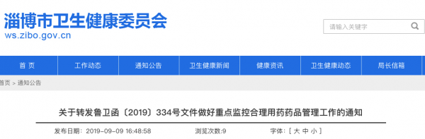 近日,山东省淄博市卫健委发布《关于转发鲁卫函〔2019〕334号文件做好重点监控合理用药药品管理工作的通知》,同时下发《淄博市重点监控合理用药药品目录》。