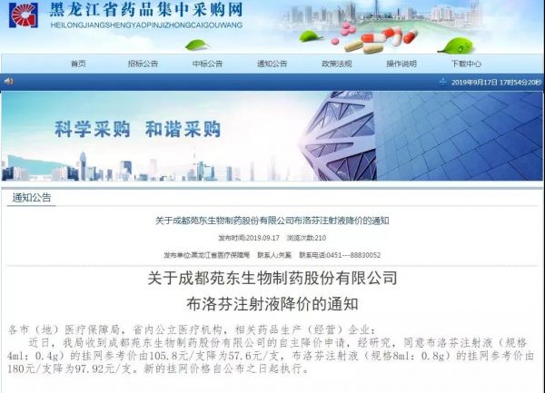 9月17日,黑龙江省医保局发布关于成都苑东生物制药股份有限公司布洛芬注射液降价的通知,成都苑东主动将布洛芬注射液(规格4ml:0.4g)、(规格8ml:0.8g)的挂网参考价分别由105.8元/支降为57.6元/支、180元/支降为97.92元/支。