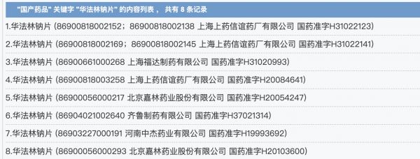 赛柏蓝在国家药监局官网以”华法林钠片“为关键词查询,共有8个生产批文。除了齐鲁制药外,上海上药信谊药厂有限公司、上海福达制药有限公司、北京嘉林药业股份有限公司、河南中杰药业有限公司均为生产企业。