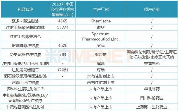 87个注射剂中有12个注射剂目前还未有仿制产品获批上市,其中有7个品种仅原研厂家上市销售,有2个品种未有注射剂型上市销售,有3个品种市场处于空白状态。12个注射剂中有5个已有企业布局首仿。
