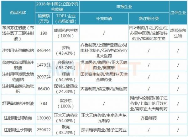 注射用头孢曲松钠、盐酸帕洛诺司琼注射液、注射用甲泼尼龙琥珀酸钠、注射用比阿培南、注射用生长抑素5个品种在2018年中国公立医疗机构终端的销售额均超过10亿元,可见大品种更受药企们“青睐”。