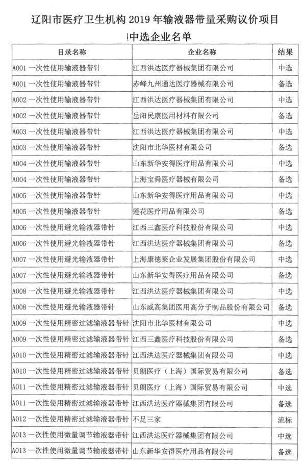 从反馈的结果来看,现场报价成功80条,最终确定德国贝朗、山东新华安得、上海康德莱、江西洪达、沈阳北华和江西三鑫等1个进口品牌、5个国产品牌的12项产品中选。