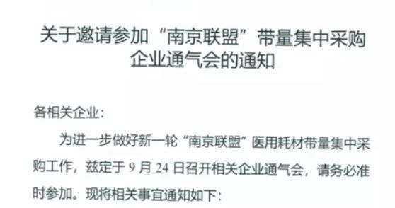 近日,一份《关于邀请参加“南京联盟”带量集中采购企业通气会的通知》在业内流传,显示为进一步做好新一轮南京联盟医用耗材带量集中采购工作,兹定于9月24日召开企业通气会。
